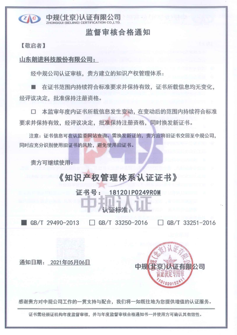 2021年5月6日,朗進科技收到中規(guī)(北京)認證有限公司簽發(fā)的《監(jiān)督審核合格通知書》,批準公司知識產權管理體系保持認證證書注冊資格。這標志著公司知識產權體系管理經過一年的運行,符合體系管理的規(guī)范化要求,通過體系審核認證。