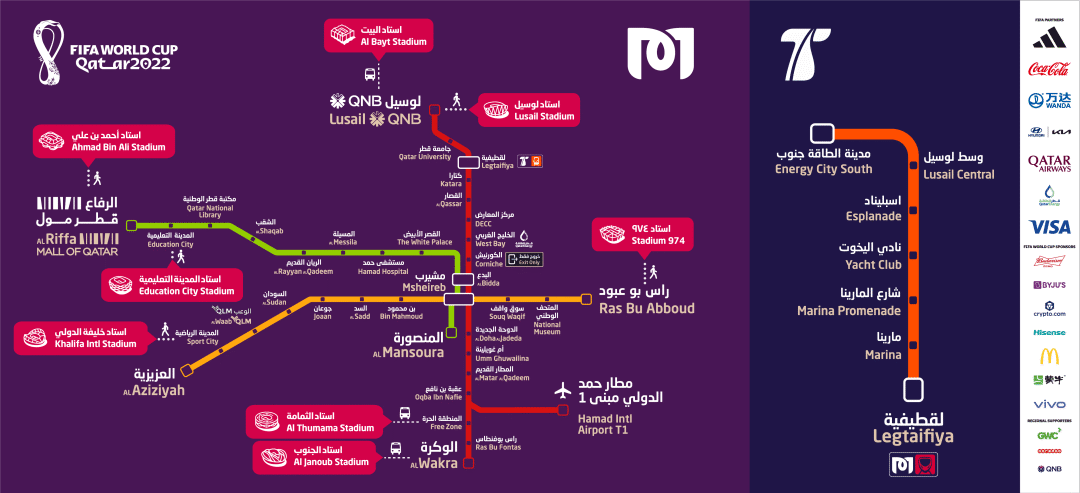 以第一條地鐵線紅線為例,最南端的艾爾沃克拉站是賈努布球場(chǎng),最北端的盧塞爾站是盧塞爾球場(chǎng);金線,最東邊的拉斯布阿布德站是974球場(chǎng),最西邊的體育城站是哈里法國際體育場(chǎng);綠線,最西邊的爾里法卡塔爾購物中心站是本·阿里球場(chǎng),相隔一站,便是教育城體育場(chǎng)。