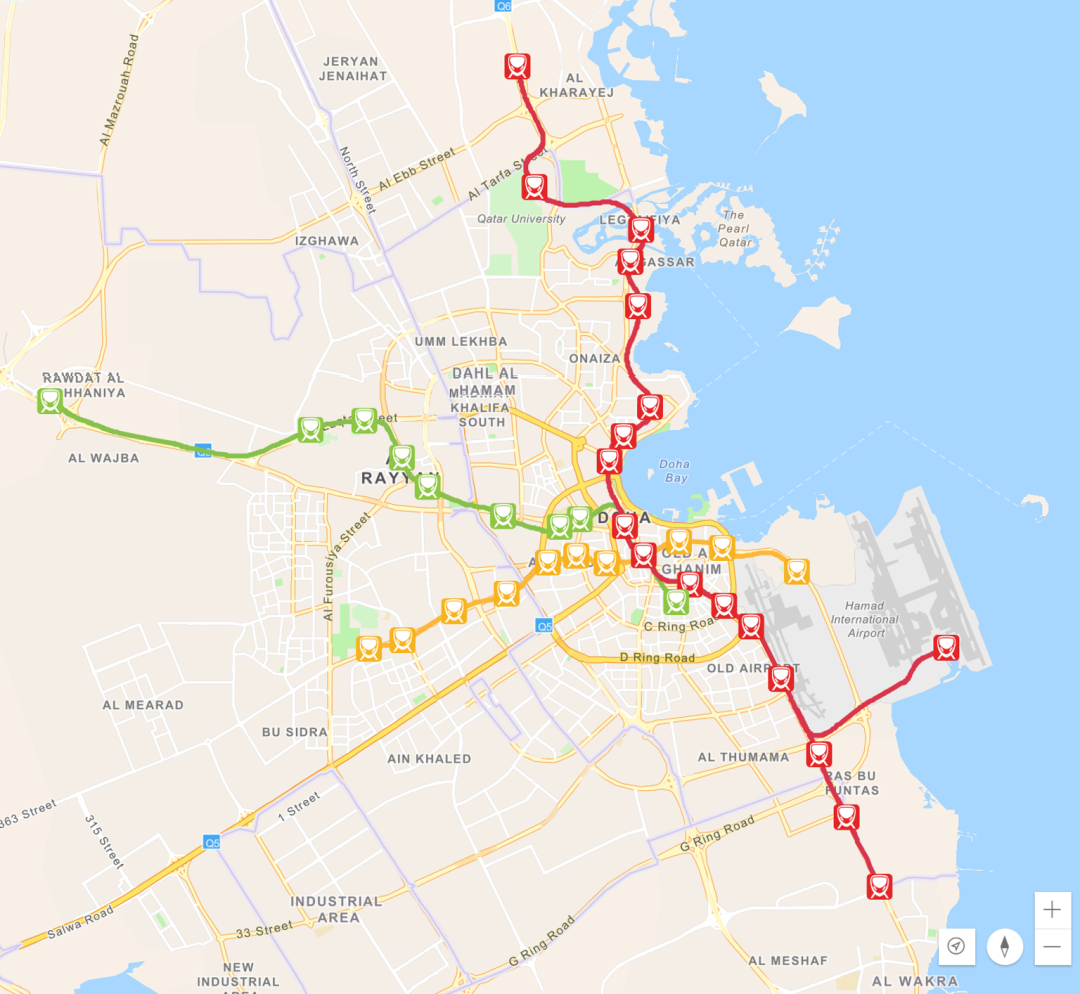 紅線南起瓦克拉,北至盧賽爾,全長40公里。這條線路還將 1 號(hào)航站樓的哈馬德國際機(jī)場(chǎng)連接到市中心。它目前有 18 個(gè)活躍的站點(diǎn),特別是西灣 - 卡塔爾能源、卡塔拉和卡塔爾大學(xué)。紅線有兩個(gè)地鐵線路換乘站——Al Bidda 用于紅線和綠線之間的換乘,Msheireb 用于所有三條線路之間的換乘。它還提供地鐵和電車與 Legtaifiya 和 Lusail QNB 之間的換乘站。