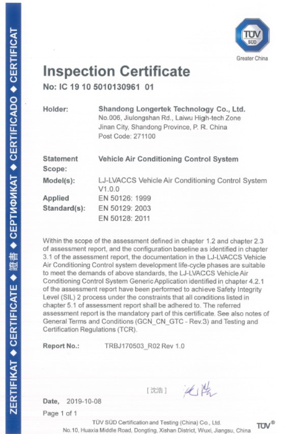 作為一種重要的公共交通工具,軌道車輛的安全性和可靠性一直得到廣泛關(guān)注。為進(jìn)一步提升軌道車輛空調(diào)產(chǎn)品的安全性和可靠性,山東朗進(jìn)科技股份有限公司于2017年開始著手開展軌道空調(diào)產(chǎn)品SIL2安全等級(jí)的認(rèn)證工作,經(jīng)過兩年的持續(xù)提升和改進(jìn),于2019年10月8日順利通過SIL2安全等級(jí)認(rèn)證。