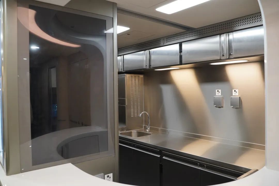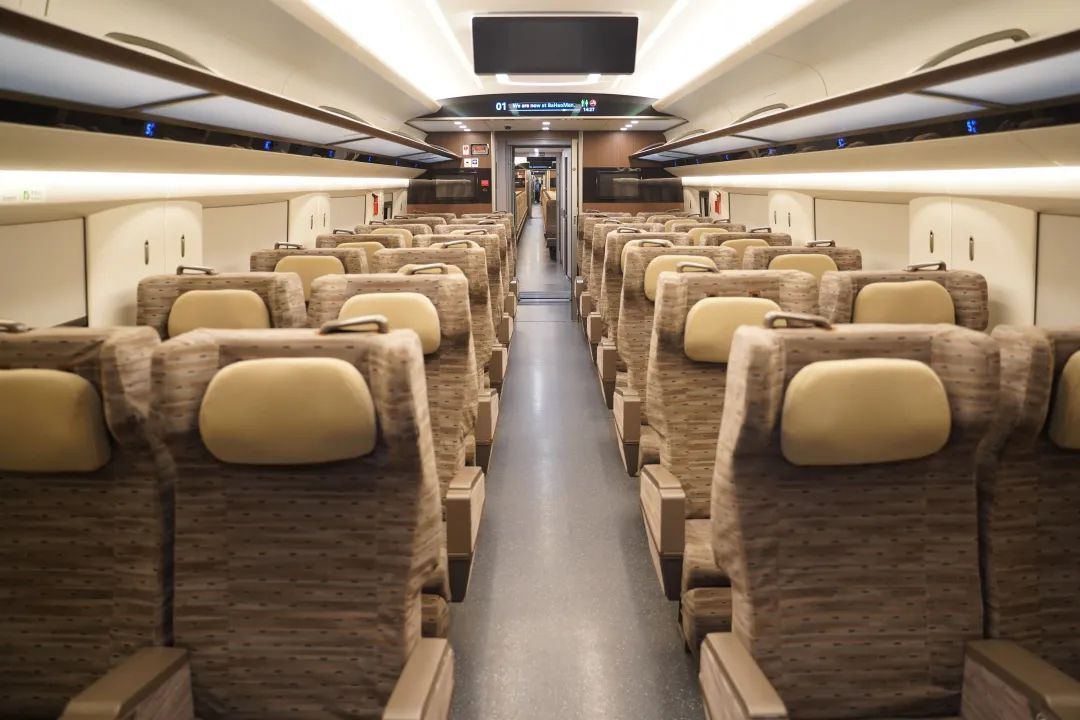 服務設施舒適便捷。車廂座椅均基于人因工程學進行優(yōu)化,讓旅客乘坐更加舒適、體驗更美好。二等座椅靠背上增加方便旅客使用的USB充電接口,加深小桌板杯托凹槽深度,提高水杯放置的穩(wěn)定性。一等座椅增加電動腿靠、可調(diào)節(jié)頭靠,座椅間設置雙USB口插座,方便旅客取用。商務倉采用“魚骨式”布局設計,一人一艙,保證乘坐私密性,座椅增加無線充電、手機投屏、在線觀影等功能,滿足商務旅客需求。4號車廂為無障礙車廂,配備更寬的通過門、無障礙衛(wèi)生間、輪椅及大件行李放置區(qū)等,所有服務設施均增加盲文標識,更好地滿足特殊旅客的出行需求。