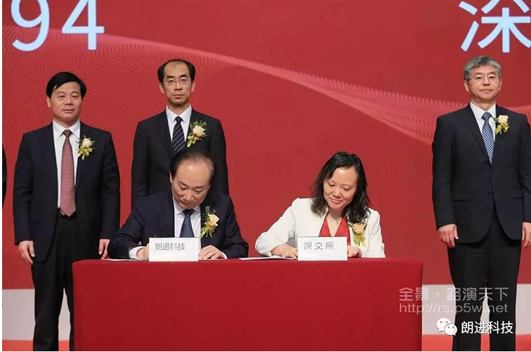 深交所總工程師喻華麗女士與朗進科技公司董事長李敬茂先生簽署了《證券上市協(xié)議》