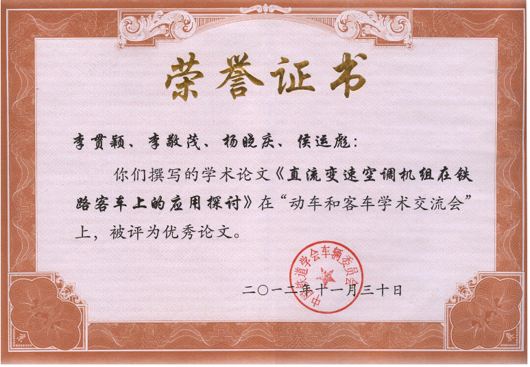 在中國鐵道學(xué)會車輛委員會動車、客車學(xué)術(shù)交流會優(yōu)秀論文評選活動中,我公司《直流變速空調(diào)機組在鐵路客車上的應(yīng)用探討》被評選為優(yōu)秀論文.