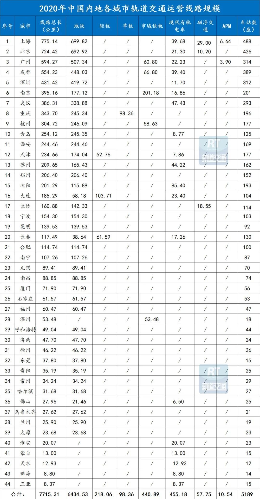 截至2020年12月31日,我國(guó)內(nèi)地共有44座城市開(kāi)通城軌運(yùn)營(yíng)里程7715.31公里,運(yùn)營(yíng)車(chē)站達(dá)到5189座。