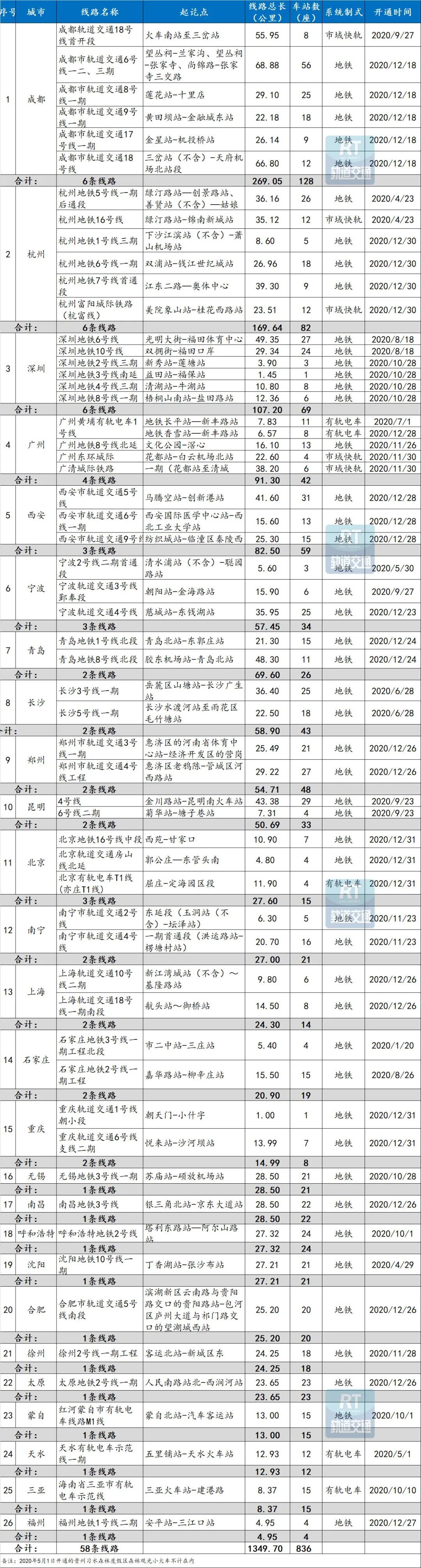 2020年中國(guó)城軌新增運(yùn)營(yíng)線(xiàn)路一覽