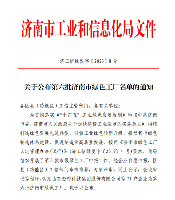 為貫徹落實(shí)《“十四五”工業(yè)綠色發(fā)展規(guī)劃》和《中共濟(jì)南 市委、濟(jì)南市人民政府關(guān)于加快建設(shè)工業(yè)強(qiáng)市的實(shí)施意見(jiàn)》,持續(xù) 打造綠色發(fā)展先進(jìn)典型,引領(lǐng)工業(yè)綠色轉(zhuǎn)型升級(jí),推動(dòng)濟(jì)南市綠色制造體系建設(shè),促進(jìn)制造業(yè)高質(zhì)量發(fā)展,按照《濟(jì)南市綠色工廠(chǎng)認(rèn)定管理辦法(試行)》(濟(jì)工信綠發(fā)字〔2019〕4 號(hào))要求,濟(jì)南市工信局組織開(kāi)展了第六批市級(jí)綠色工廠(chǎng)申報(bào)工作。