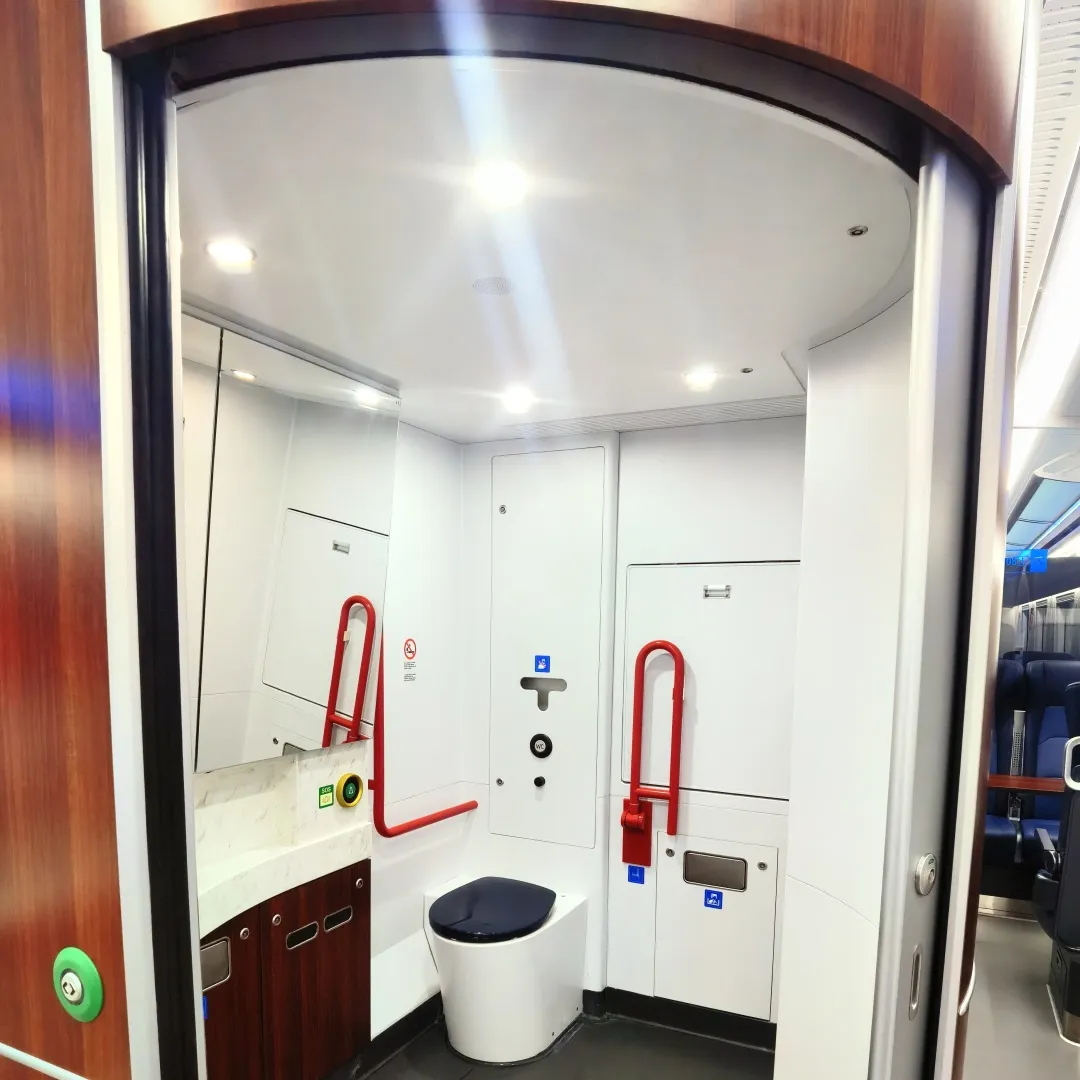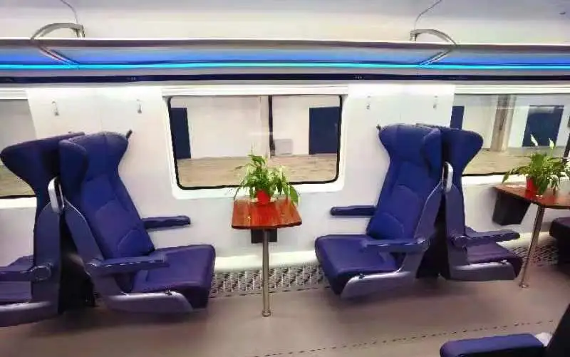 匈塞鐵路高速動(dòng)車組為動(dòng)力分散型電力動(dòng)車組,最高運(yùn)行時(shí)速200公里,全長(zhǎng)約103米,采用4輛編組,設(shè)一等座車1輛、二等座車3輛,總定員250人,動(dòng)車組配置動(dòng)力電池,在無電區(qū)域仍具備自主續(xù)航能力。車體外觀呈流線型,采用塞爾維亞國(guó)旗色“紅、藍(lán)、白”三色涂裝,車頭側(cè)面黑色區(qū)域造型提取了塞爾維亞國(guó)徽雙頭鷹元素,藍(lán)色漸變的色帶宛如雄鷹展開的羽翼;紅藍(lán)兩條色帶分別象征著“新絲綢之路”和“21世紀(jì)海上絲綢之路”,體現(xiàn)了中塞兩國(guó)高質(zhì)量共建“一帶一路”,攜手實(shí)現(xiàn)共同發(fā)展繁榮的美好愿景;內(nèi)裝色彩與車外造型相互呼應(yīng),氛圍燈、智能座位顯示等細(xì)節(jié)充分體現(xiàn)動(dòng)車組現(xiàn)代化、智能化、人性化的設(shè)計(jì)理念。動(dòng)車組車廂內(nèi)設(shè)置輪椅、自行車、大件行李存放區(qū),配備咖啡機(jī)、售賣機(jī)等服務(wù)設(shè)施,努力滿足旅客多樣化需求。